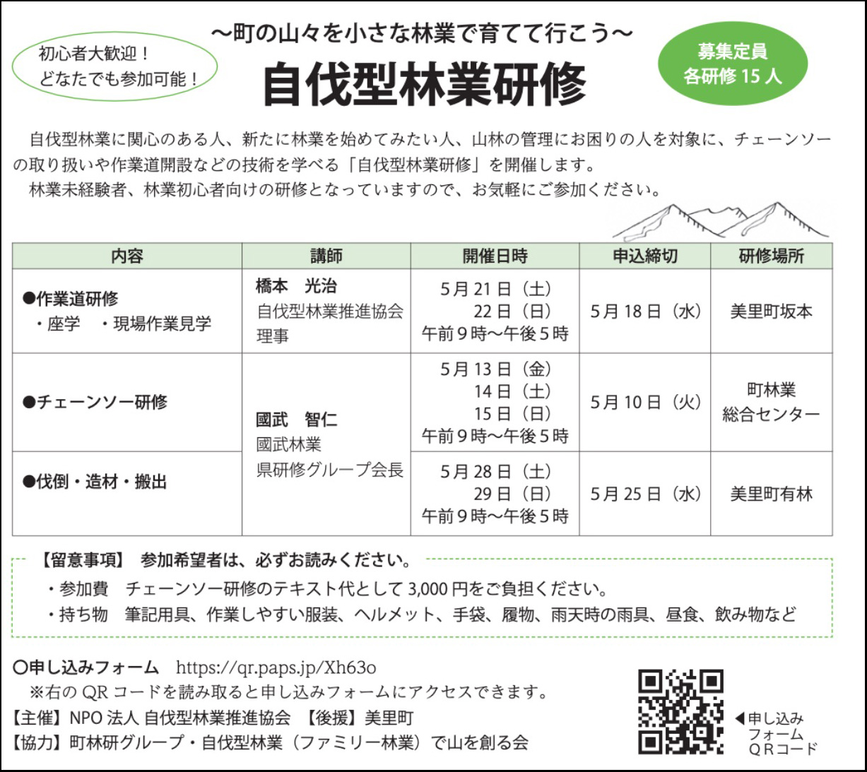 ・参加費:チェーンソウ研修のテキスト代として3,000円をご負担下さい。
