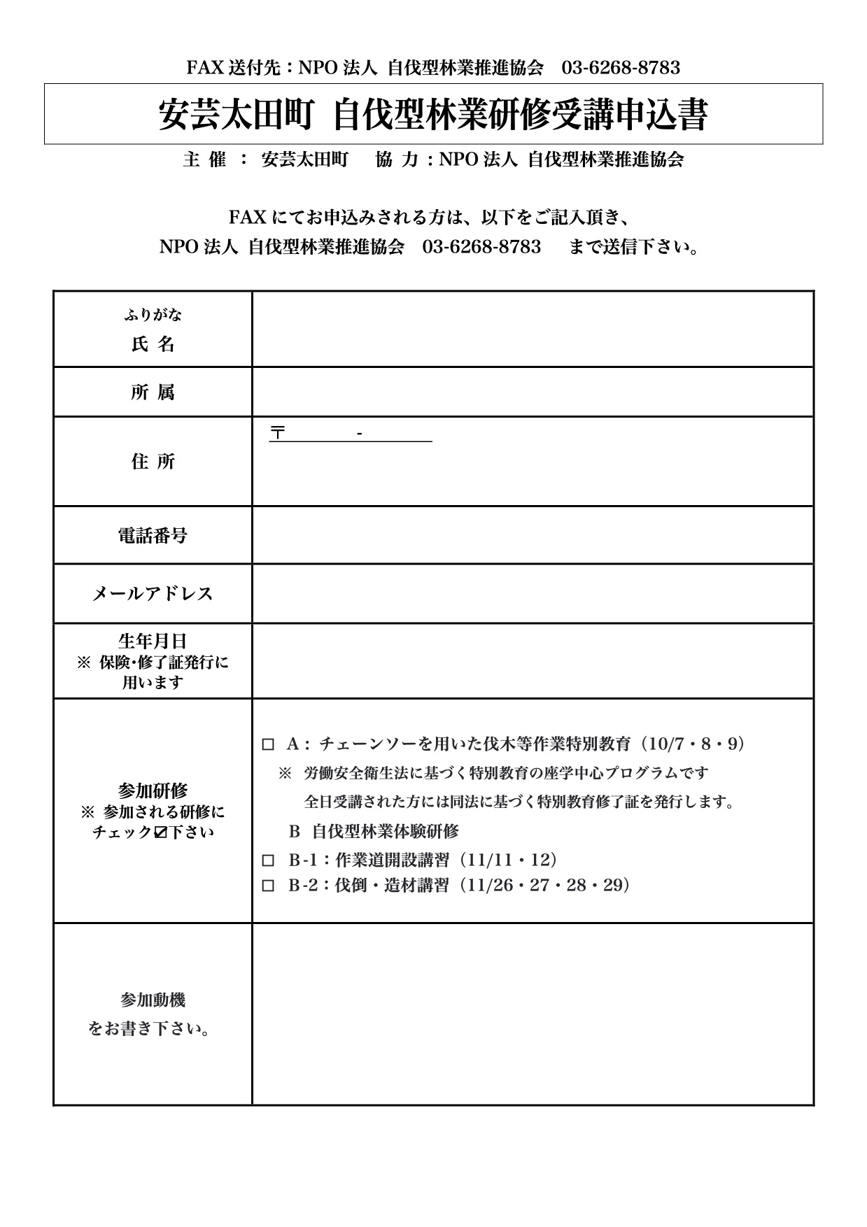 FAX 03-6268-8783(NPO法人自伐型林業推進協会事務局)