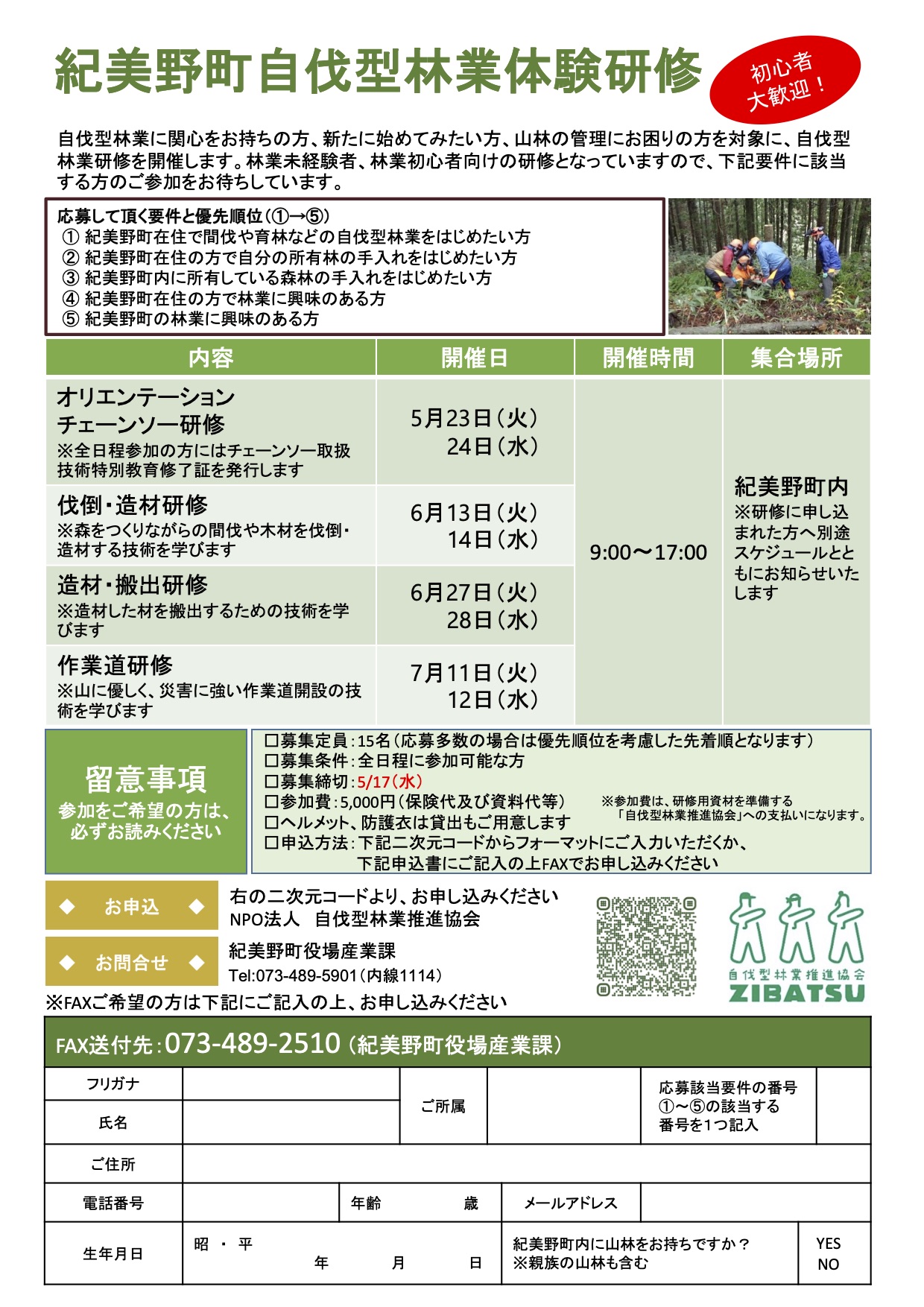 参加を希望される方は令和5年5月17日(水曜日)までに下記フォームからお申し込みいただくか、R5紀美野町自伐型林業体験研修チラシをダウンロードして、産業課へお申し込みください。