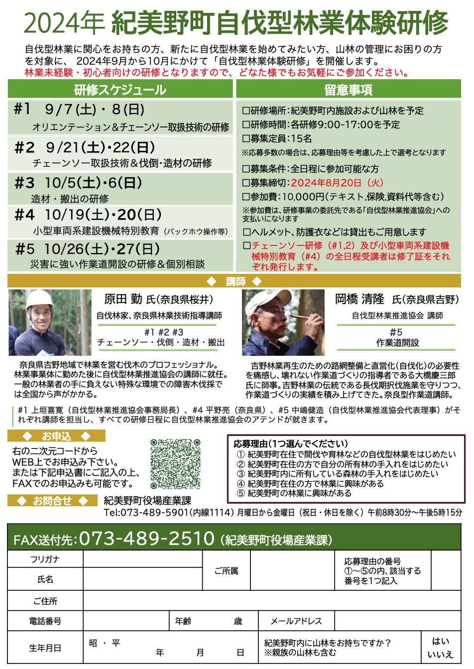 なお、詳細につきましては、下記のR6紀美野町自伐型林業体験研修チラシをご覧ください。