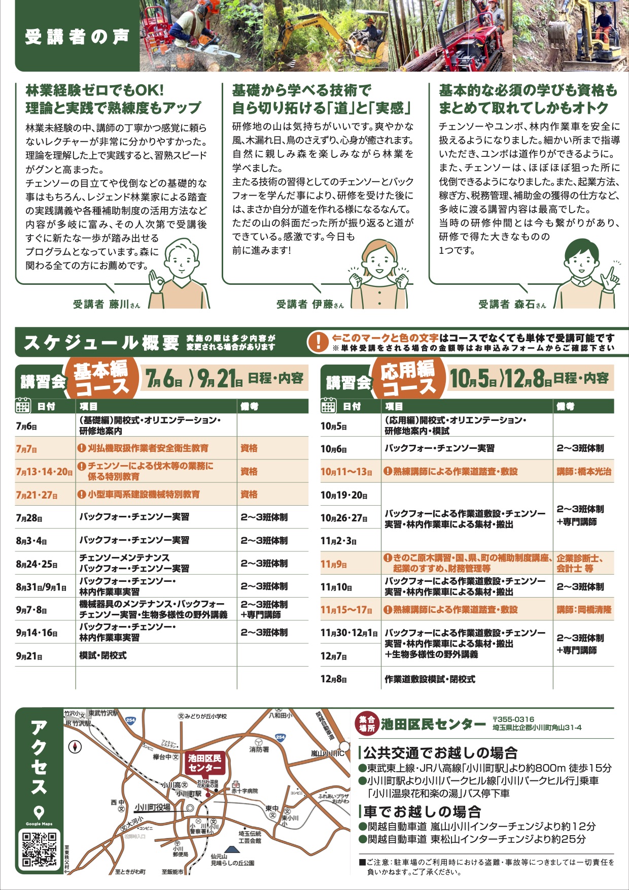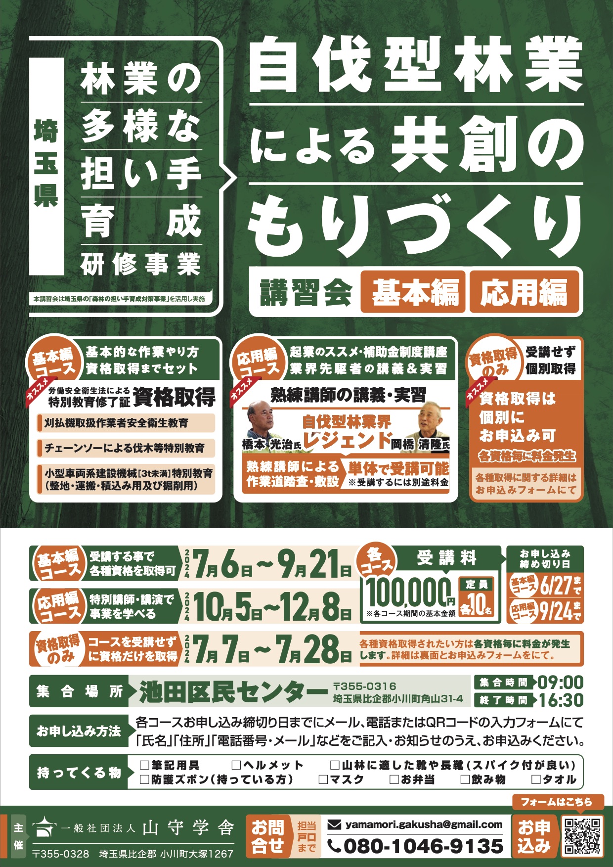 埼玉県森林の担い手育成対策事業、林業の多様な担い手育成研修事業の支援により、一般社団法人 山守学舎が主催する自伐型林業による共創のもりづくりプログラムの申し込みフォームです。原則必須日程に参加できる方のみとさせて頂きますが、個別での資格取得や道作り研修等の受講もお受けいたします。