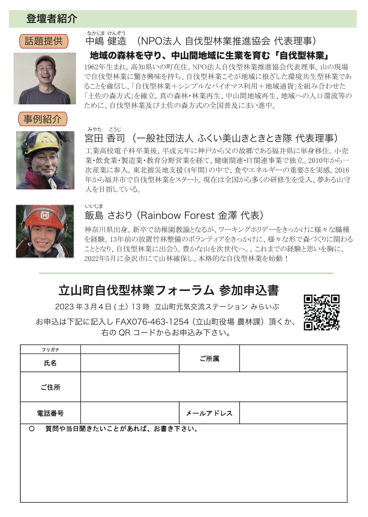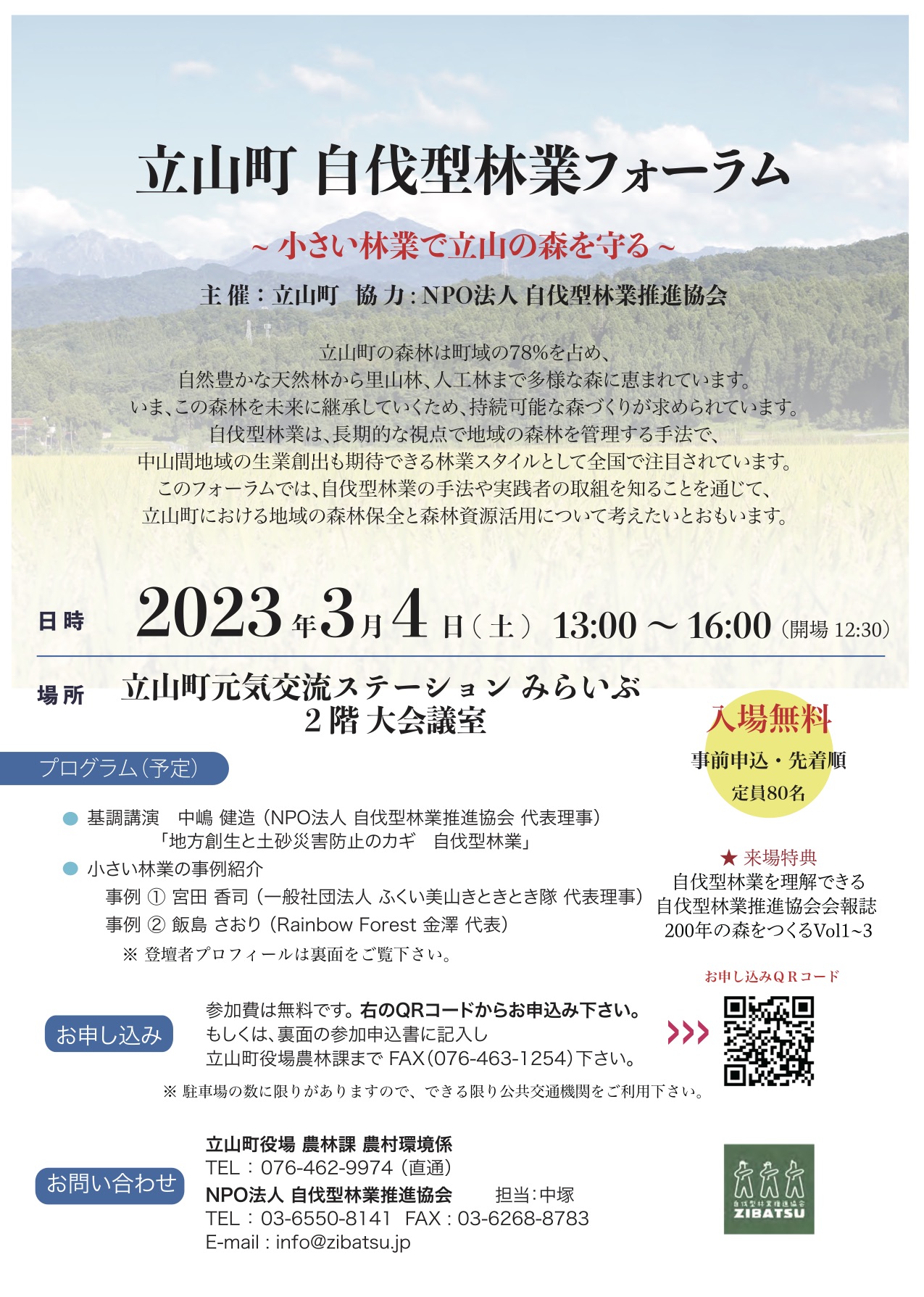 3月4日開催!自伐型林業フォーラム ~ 小さい林業で立山の森を守る~ @富山県立山町