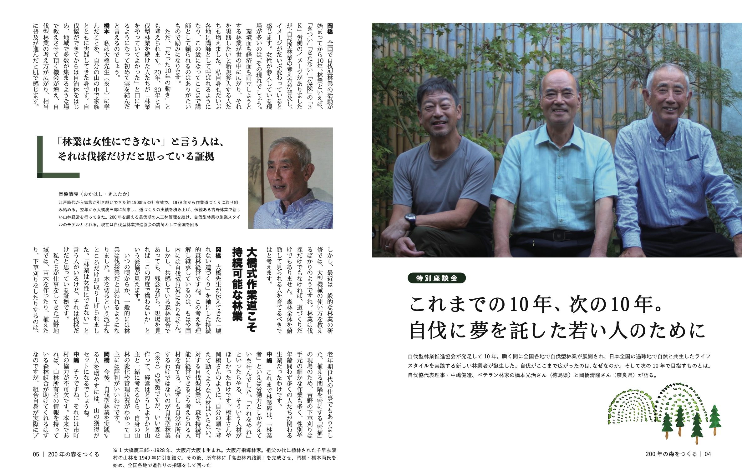 今回のテーマは「これまでの10年、次の10年」です。自伐型林業推進協会が設立して10周年を記念した企画。16ページのカラーページで、会員の活動や当会の事業のことなどを写真とともにまとめております。